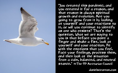 Vocês criaram essa pandemia e a criaram por uma razão, e essa razão é sempre o crescimento e a evolução espiritual. Vocês vão crescer a partir dela olhando para si mesmos e suas reações a ela, ou vão continuar a se identificar como alguém que resiste? Essa é a questão. O que estamos dizendo a vocês é que antes de apontarem o dedo e apertarem o punho, olhem para si mesmos e para sua reação. Fiquem com as emoções que vocês sentem. Enfrentem seus sentimentos, processem-os e, em seguida, observem a situação de uma postura calma, equilibrada e neutra.
