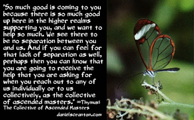 Tanta coisa boa está vindo para vocês porque há muita coisa boa aqui nos reinos mais elevados apoiando vocês, e queremos ajudar muito. Vemos que não há separação entre vocês e nós. E se vocês também podem sentir essa falta de separação, talvez então vocês possam saber que receberão a ajuda que estão pedindo quando chegarem a qualquer um de nós individualmente ou coletivamente, como o coletivo dos Mestres Ascensos.